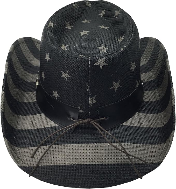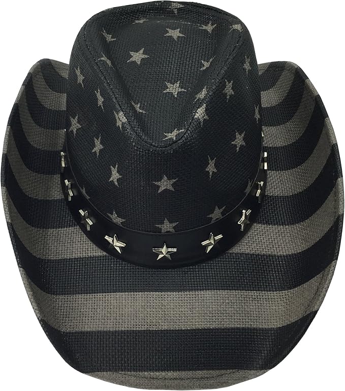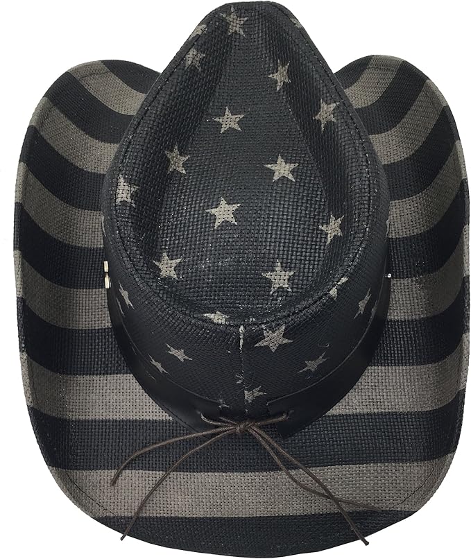 - PATRIOTIC BLACK & GRAY AMERICAN FLAG HAT: Stand out with this bold twist on the classic American flag hat, featuring a distressed black and gray U.S. flag design. Whether you’re dressing up for a concert, rodeo, or holiday, this stylish cowboy hat is a must-have for proud patriots.