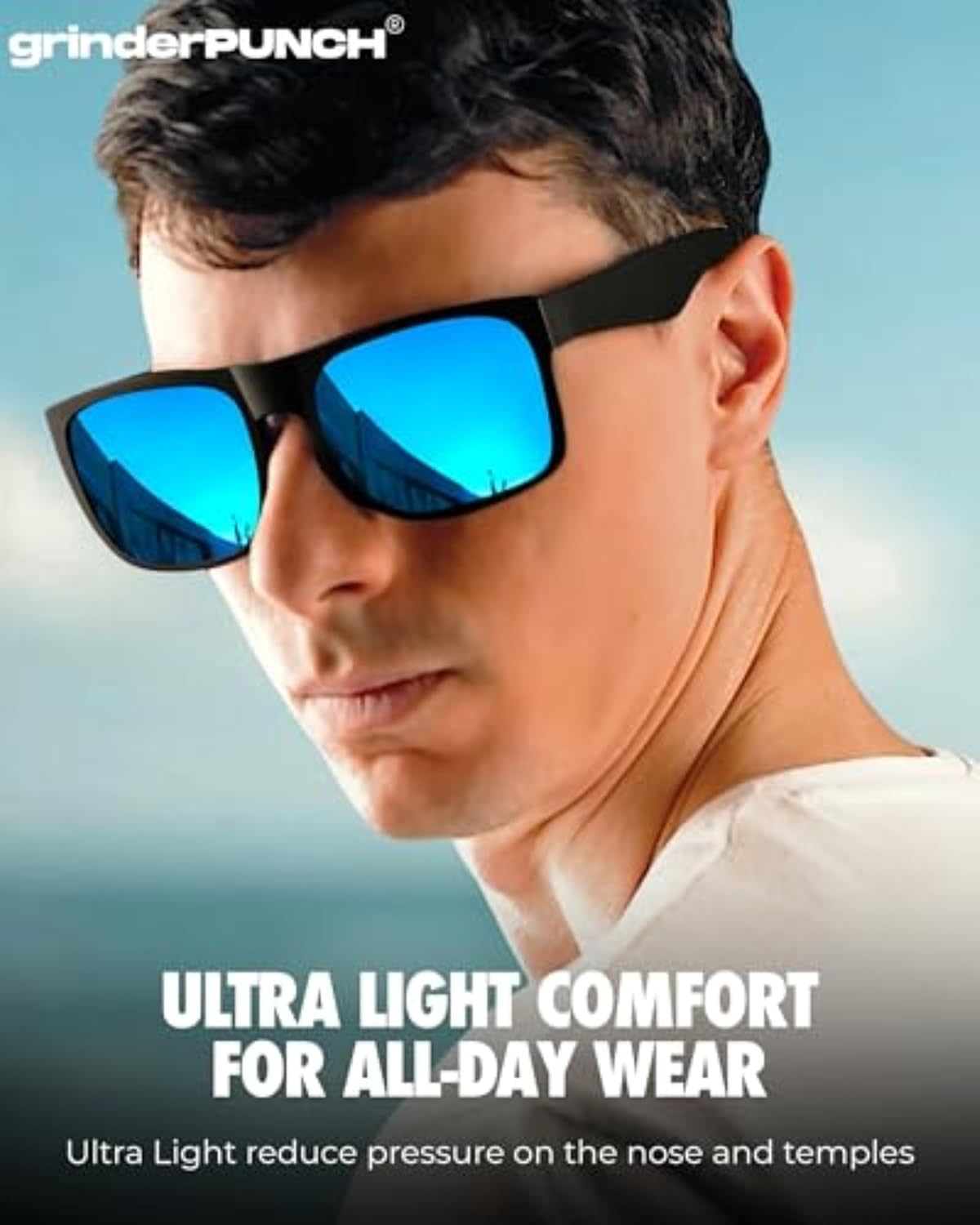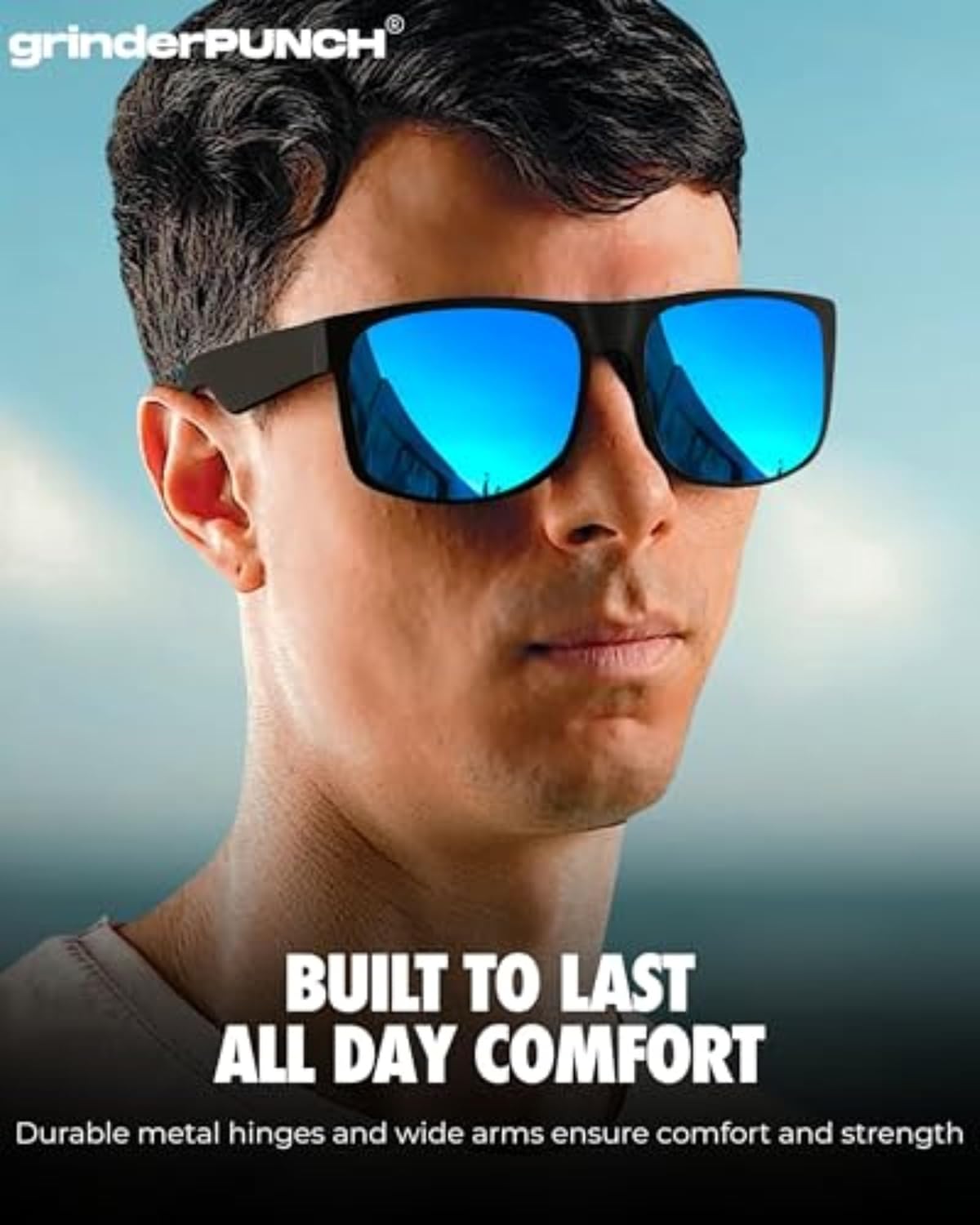 grinderPUNCH XL Oversized Polarized Sunglasses for Men – Wide Fit for Big Heads, Matte Frame, Blue Mirror Lens