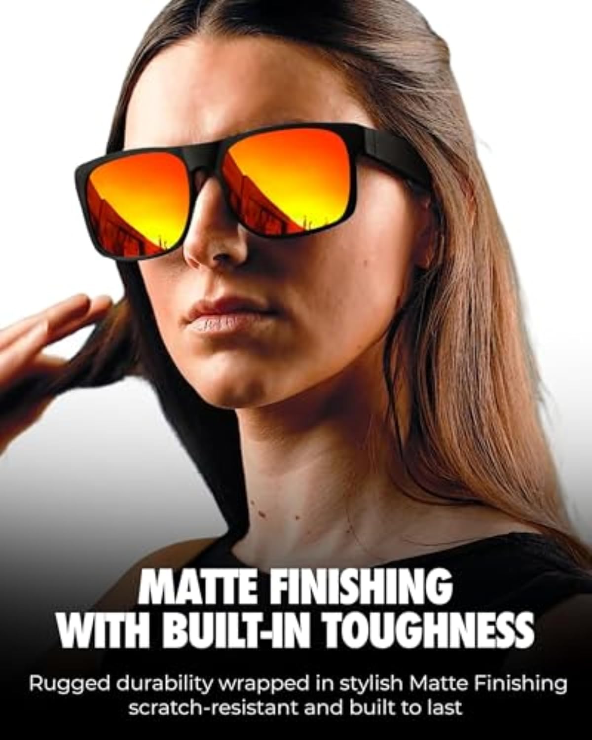 Description- PREMIUM POLARIZED RED LENSES FOR ENHANCED CLARITY: Crafted with advanced polarization technology, these premium red polarized sunglasses are built to reduce glare from surfaces like water, pavement, and snow. The vivid red mirrored lenses elevate your look with bold, modern appeal while enhancing contrast and sharpness. Ideal for women seeking oversized sunglasses for women that offer function and standout fashion, they provide clear vision even in harsh sunlight.
